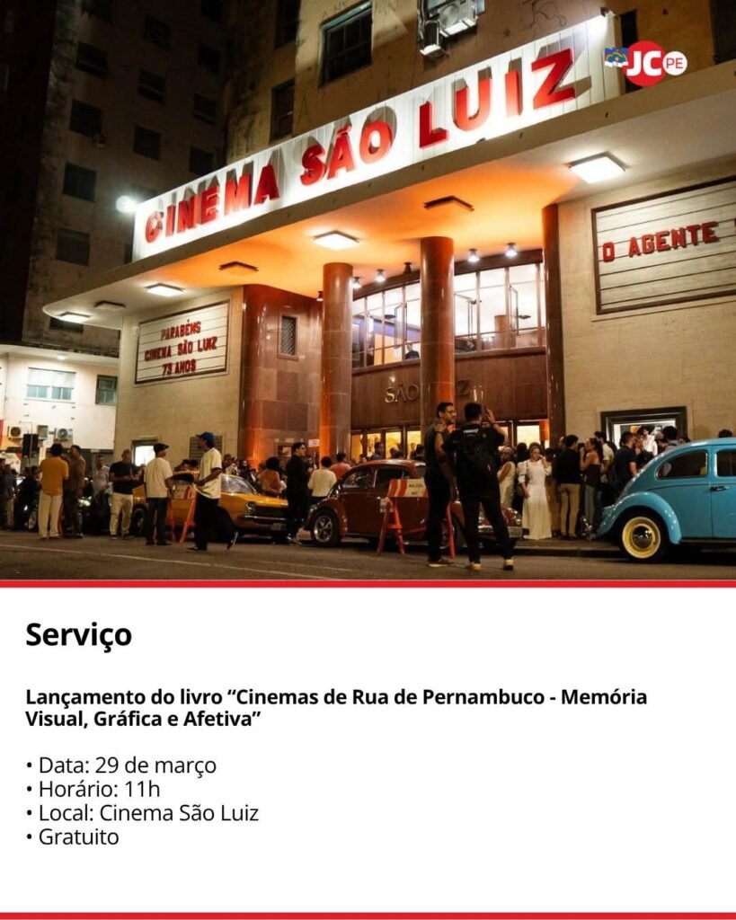 A história de vinte cinemas de rua de Pernambuco e a relação afetiva da população com os equipamentos foram reunidos no novo livro do Coletivo CineRuaPE.“Cinemas de Rua de Pernambuco – Memória Visual, Gráfica e Afetiva” será lançado neste domingo (29), às 11h, em um dos espaços retratados, o emblemático Cinema São Luiz, área central do Recife.A obra, construída a partir do cruzamento de diferentes processos de pesquisa que vão de documentos a entrevistas, apresenta registros fotográficos do estado atual de cada uma das salas pesquisadas.O projeto realizado pelo Coletivo busca, ainda, celebrar os dez anos de trabalho da entidade da sociedade civil em prol da retomada e manutenção de equipamentos históricos que ainda resistem ao tempo e suas mudanças.São contemplados cinemas das regiões Metropolitana de Recife, Zona da Mata, Agreste e Sertão. O livro conta com versão digital com acessibilidade.A pesquisa e os textos foram produzidos pelos pesquisadores Bárbara Lino, Bruna Tavares, Karuna de Paula, Kate Saraiva e Walter Andrade e os registros fotográficos por Eduardo Cunha, com o recorte do estado atual de cada uma das salas pesquisadas, incluindo elementos da arquitetura, fachadas, cabines de projeção, entre outros.O projeto de pesquisa “Cinemas de Rua de Pernambuco – Memória Visual, Gráfica e Afetiva” é uma realização do CineRuaPE, com incentivo da Lei Paulo Gustavo, por meio do Ministério da Cultura e do Governo do Estado de Pernambuco.Fundado em novembro de 2015, o Movimento CineRuaPE, hoje Coletivo CineRuaPE, tem o objetivo de reunir esforços, promover atividades e discutir estratégias de continuidade, sustentabilidade e conscientização da importância de preservação dos cinemas de rua restantes de Pernambuco, a fim de propor a criação de um circuito independente de salas.Arraste para o lado e confira mais detalhes.Foto: Divulgação/Fundarpe*jk *digital